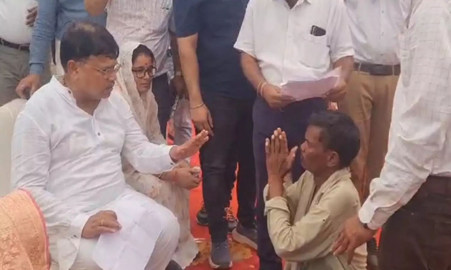 दरअसल, शिवपुरी के प्रभारी मंत्री प्रद्युम्न सिंह तोमर पीएम जनमन आवास के कार्यक्रम (PM Janman Awas program) में स्वागत होने के बाद बैठे ही थे, उसी दौरान हरिगोविंद आदिवासी उनके पास रस्सी और अपने कागजात लेकर पहुंच गया। उसने मंत्री प्रद्युम्न सिंह तोमर (Minister Pradyuman Singh Tomar) से कहा कि उसकी जमीन पर पटवारी शिवा पांडे ने मेरी जमीन पर कब्जा कर रखा है। मैं इस बात की शिकायत प्रशासन से लेकर अन्य जगहों पर कर चुका है लेकिन, सुनवाई नहीं हो रही है, अब मैं आपके सामने रस्सी से फांसी लगाकर आत्महत्या करुंगा।