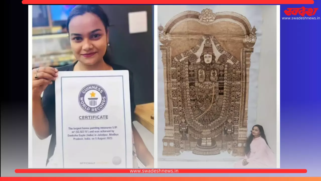 Jabalpur News: जबलपुर। मध्य प्रदेश के जबलपुर की एक लड़की ने मेहंदी का इस्तेमाल करके तिरुपति बालाजी की 9 फुट ऊंची शानदार पेंटिंग बनाकर गिनीज बुक ऑफ वर्ल्ड रिकॉर्ड में अपना नाम दर्ज कराया है। इस अविश्वसनीय उपलब्धि के पीछे की कलाकार दीक्षा गुप्ता ने न केवल अपने परिवार को गौरवान्वित किया है, बल्कि अपनी असाधारण प्रतिभा से जबलपुर को भी मानचित्र पर ला खड़ा किया है।