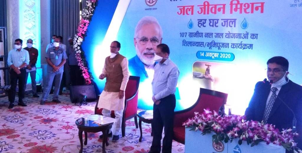 भोपाल। मध्य प्रदेश के मुख्यमंत्री शिवराज सिंह चौहान ने आज गैर उपचुनाव वाले 33 जिलों में 107 ग्रामीण पेयजल कार्यो का भूमिपूजन वीडियो कॉन्फ्रेंसिंग के जरिये भोपाल के मिंटो हाल से किया। मख्यमंत्री शिवराज ने गांवों में हो रही पानी की समस्या को दृष्टिगत रखते हुए आज पेयजल योजना का भूमिपूजन किया।