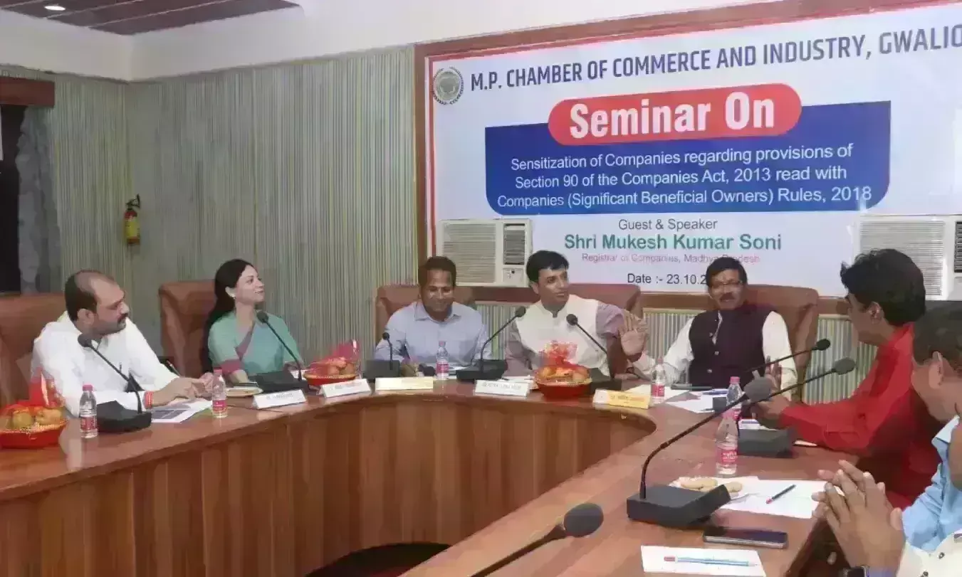 ग्वालियर। रजिस्ट्रार ऑफ कम्पनीज मध्यप्रदेश के सहयोग से मप्र चेम्बर ऑफ कॉमर्स द्वारा कंपनी अधिनियम की धारा 90 के संबंध में कंपनियों को निवेशकों के प्रति संवेदनशील बनाने के लिए एक सेमीनार का आयोजन सोमवार को चेम्बर भवन में किया गया। सेमीनार में रजिस्ट्रार ऑफ कम्पनीज के मुकेश कुमार सोनी, उप पंजीयक डॉ. अंजलि पोखरियल एवं तकनीकी सहायक आशीष तिवारी उपस्थित रहे। स्वागत भाषण चेम्बर अध्यक्ष डॉ. प्रवीण अग्रवाल ने दिया।