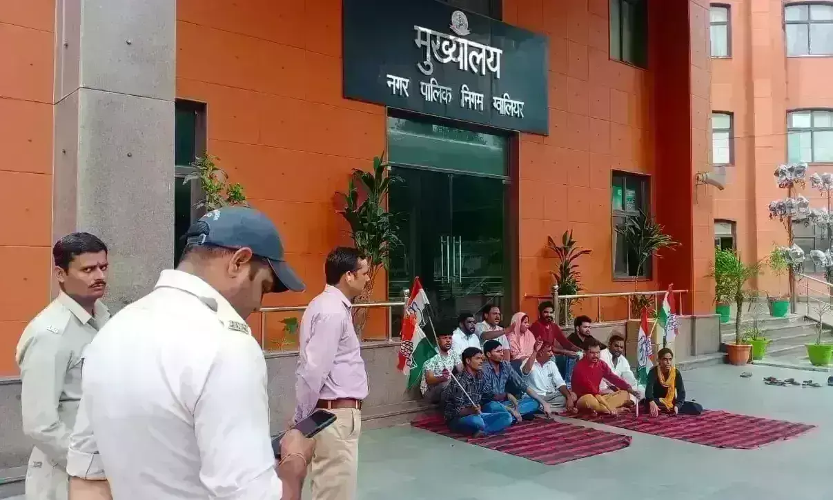 ग्वालियर निगम मुख्यालय पर धरने पर बैठे कांग्रेस के पार्षद, सभापति ने कहा - महापौर अपने कार्य में असफल साबित हो रहीं हैं