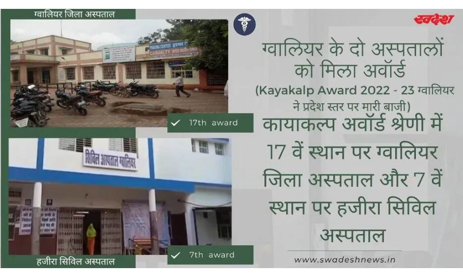 कायाकल्प अवॉर्ड श्रेणी में ग्वालियर जिला अस्पताल को 17वां और सिविल अस्पताल हजीरा मिला 7वां स्थान