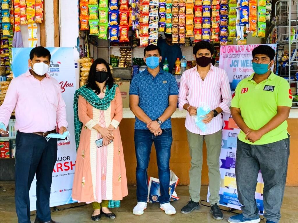 ग्वालियर,न.सं.। जेसीआई ग्वालियर आदर्श द्वारा जेसीआई सप्ताह के अंतर्गत बुधवार को शहर के विभिन्न स्थानों पर तीन हजार मास्कों का वितरण किया गया। इस मौके पर अध्यक्ष विवेक खंडेलवाल, अंजलि बत्रा, रोहित शर्मा, विजेता सिंह एवं नितिन अग्रवाल आदि उपस्थित थे।