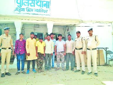 पुलिस अधीक्षक नवनीत भसीन को मुखबिर से सूचना मिली थी कि मोहना नेशनल हाइवे पर संचालित ढाबों पर देह व्यापार का धंधा जमकर फल-फूल रहा है। सूचना मिलते ही पुलिस ने तीन ढाबों पर दबिश दी तो यहां पर देह-व्यापार का धंधा करते हुए तीन युवतियां रंगे हाथ पकड़ी गई। पुलिस को देखकर ढाबों पर अफरा-तफरी मच गई और कुछ युवक भागने का प्रयास करने लगे। पुलिस ने युवतियों के साथ आपत्तिजनक स्थिति में संचालक अरुण पुत्र मक्खनलाल शर्मा निवासी मोहना, शेरा पुत्र साहबसिंह यादव निवासी हीरापुरा श्योपुर, सोनू पुत्र बीरवल गुर्जर निवासी चौकुटी थाना नूराबाद मुरैना, भगवान पुत्र प्रहलाद कुशवाह निवासी उम्मेदगढ़ मोहना, दीपक पुत्र संतोष मुद्गल निवासी मोहना, बलवीर पुत्र काशीराम गुर्जर निवासी चौकुटी नूराबाद मुरैना और अवधेश पुत्र कैलाश शर्मा निवासी गसवानी श्योपुर को गिरफ्तार किया है। इनके खिलाफ मामला दर्ज कर पूछताछ की जा रही है। मोहना थाना प्रभारी रामनरेश यादव ने बताया कि तीन ढाबों पर लम्बे समय से सुबह से लेकर रात तक देह व्यापार किया जाता था। एक महिला बाहर गुमठी पर बैठ जाती थी। जैसे ही कोई युवक ढाबे पर पहुंचता, उससे गलत कार्य के लिए सौदा तय करने के बाद उसे ढाबे के अंदर भेज दिया जाता था। जिस समय पुलिस ने दबिश दी उस समय तीन युवक युवतियों के साथ आपत्तिजनक हालत में थे। जबकि अन्य लोग संचालक और देह व्यापार में मददगार हैं। पुलिस ने सभी आरोपियों के खिलाफ अनैतिक व्यापार निवारण अधिनियम 1956 की धारा के तहत मामला दर्ज कर लिया है।