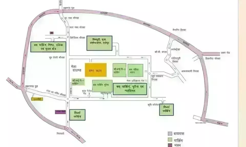 मुरैना जिले से आने वाले वाहन निरावली – अटल द्वार – जलालपुर चौराहा – मल्लगढ़ा – यादव धर्मकाटा – सिमको तिराहा – गोला का मंदिर चौराहा – सनसिटी कट – पशु मेला गेट होते हुए मेला मैदान की पार्किंग स्थल पर [पहुँच सकेंगे ।