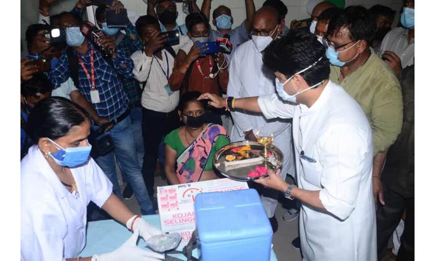 सिंधिया ने महिला का टीका कर टीकाकरण अभियान की शुरुआत की