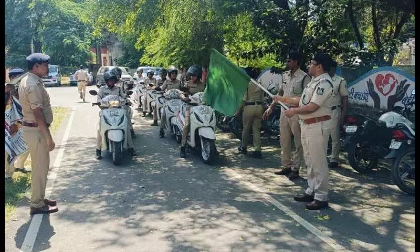 स्कूटी सवार महिला पुलिसकर्मियों को हरीझंडी दिखाते पुलिस अधीक्षक