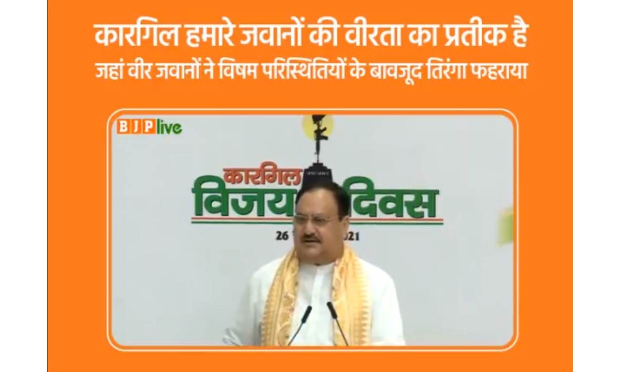 नड्डा ने भाजपा मुख्यालय में कारगिल विजय दिवस पर आयोजित कार्यक्रम को संबोधित करते हुए कहा कि भाजपा हर साल कारगिल दिवस को विजय दिवस के रूप में मनाती है। ये हमारे राष्ट्रीय कार्यक्रम के रूप में देखा जाता है। उन्होंने कहा कि कारगिल की लड़ाई एक विपरीत परिस्थितियों में लड़ी गई। उन्होंने शहीद जवानों को श्रद्धांजलि देते हुए कहा कि कारगिल की लड़ाई में हमारे योद्धाओं ने अपने शौर्य का परिचय दिया और अपनी जान को जोखिम में डालकर दुश्मनों के छक्के छुड़ाए।