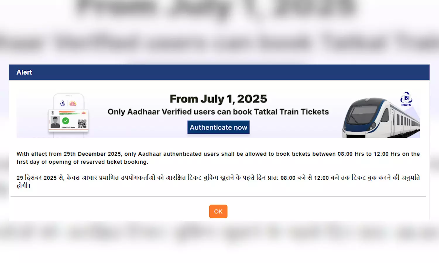 इसका मतलब यह है कि 29 दिसंबर के बाद से बिना आधार लिंक आईआरसीटीसी यूजर्स सुबह 8 से 12 बजे तक टिकट बुक नहीं कर पाएंगे। ये नियम केवल रिजर्व रेल टिकट बुकिंग खुलने के पहले दिन पर लागू होगा।