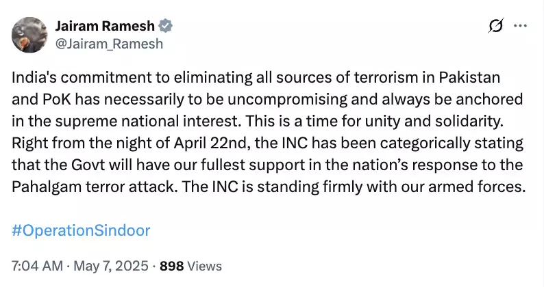 कांग्रेस सांसद जयराम रमेश ने ट्वीट किया, "पाकिस्तान और पीओके में आतंकवाद के सभी स्रोतों को खत्म करने की भारत की प्रतिबद्धता हमेशा अटल और सर्वोच्च राष्ट्रीय हित में होनी चाहिए। यह एकता और एकजुटता का समय है। 22 अप्रैल की रात से ही कांग्रेस स्पष्ट रूप से कह रही है कि पहलगाम आतंकी हमले के जवाब में सरकार को हमारा पूरा समर्थन मिलेगा। कांग्रेस हमारे सशस्त्र बलों के साथ मजबूती से खड़ी है।"