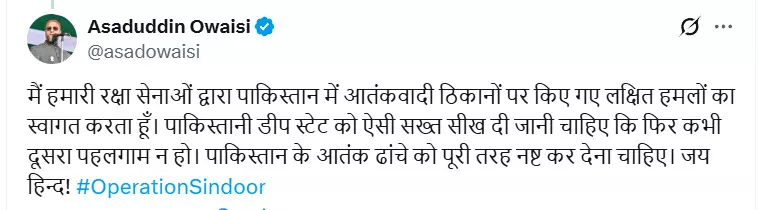 एआईएमआईएम प्रमुख असदुद्दीन ओवैसी ने 'एक्स' पर लिखा - "मैं पाकिस्तान में आतंकी शिविरों पर हमारे रक्षा बलों द्वारा किए गए सर्जिकल स्ट्राइक का स्वागत करता हूं। पाकिस्तानी डीप स्टेट को कड़ा सबक सिखाया जाना चाहिए ताकि फिर कभी पहलगाम जैसी घटना न हो। पाकिस्तान के आतंकी ढांचे को पूरी तरह से नष्ट किया जाना चाहिए। जय हिंद!"