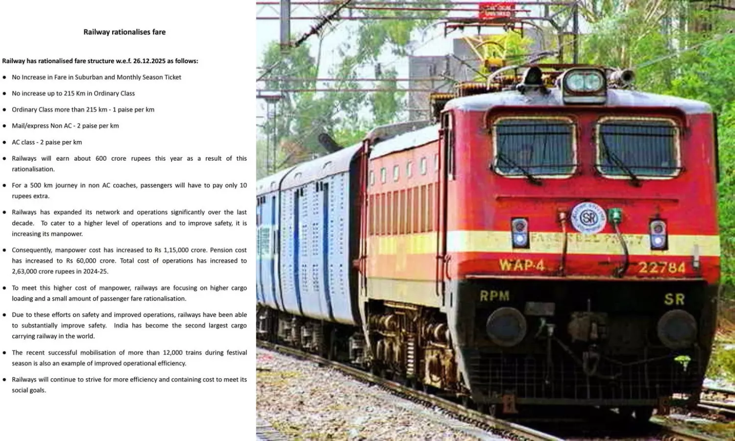 नई दिल्लीः भारतीय रेलवे में हर दिन करोड़ों यात्री सफर करते हैं। हालांकि अब यात्रा करना महंगा होने वाला है। रेलवे ने यात्री किराए में बढ़ोत्तरी की है। यह आदेश 26 दिसंबर 2025 से लागू होगा। भारतीय रेलवे ने जनरल से लेकर एसी तक रेलवे किराया बढ़ा दिया है।