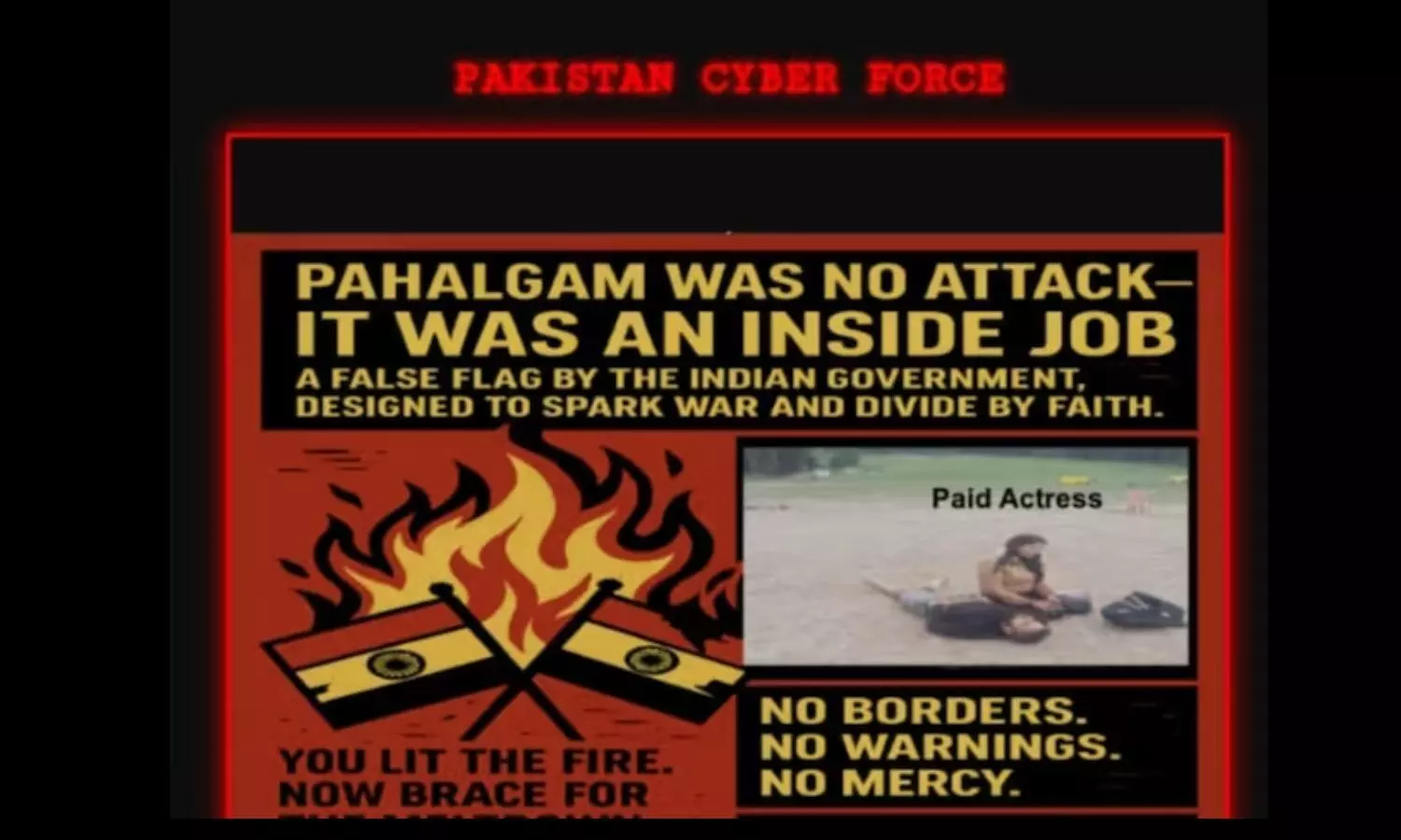 राजस्थान शिक्षा विभाग की वेबसाइट को पाकिस्तान की साइबर फोर्स ने हैक कर पहलगाम आतंकी हमले को लेकर पोस्ट डाली है। जिसमें लिखा है कि “पहलगाम हमला नहीं था बल्कि अंदरुनी हमला था। भारत सरकार ने युद्ध भड़काने और धर्म के आधार पर बांटने के लिए ऐसा किया। अपनी आंखें खोलो अपने नेताओं से सवाल करो, तुम्हारी खुफिया जानकारियां झूठी हैं।”