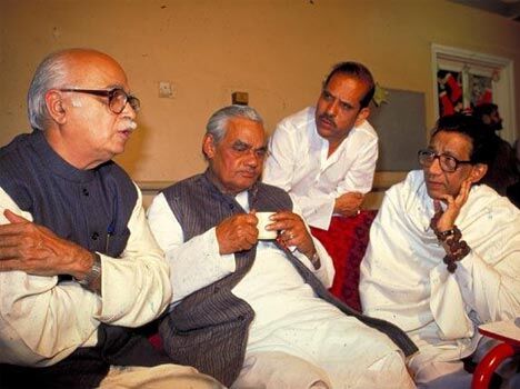 मा. अटल जी, आडवाणी जी एवं बालासाहब ठाकरे जी किसी विषय पर मंत्रणा करते हुए.