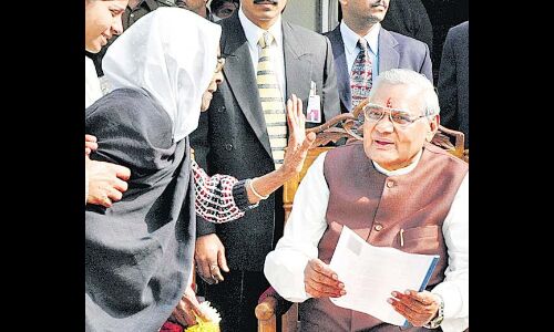 जीवाजी गंज स्थित सरोद घर में उस्ताद हाफिज अली खान की मूर्ति पर माल्यार्पण करते हुए अटल जी