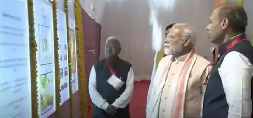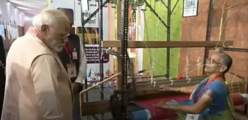 PM Modi in Mahila Sashaktikaran Mahasammelan : पीएम मोदी ने कार्यक्रम स्थल पर देवी अहिल्या को लेकर लगी प्रदर्शनी का किया अवलोकन। इसके साथ ही हथकरघा कारीगरों से बात की।