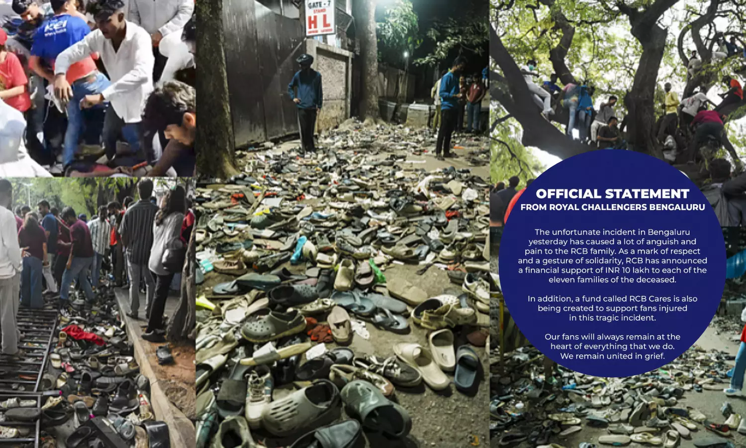 रॉयल चैलेंजर्स बैंगलोर ने आधिकारिक बयान जारी कर कहा कि बेंगलुरु में हुई दुर्भाग्यपूर्ण घटना से पूरी टीम बेहद दुखी है। सम्मान और एकजुटता के प्रतीक के रूप में उन्होंने घटना में मारे गए 11 लोगों के परिवारों को 10-10 लाख रुपये की सहायता राशि देने की घोषणा की है। साथ ही घायलों की मदद के लिए 'आरसीबी केयर्स' नाम से एक फंड शुरू किया जा रहा है।