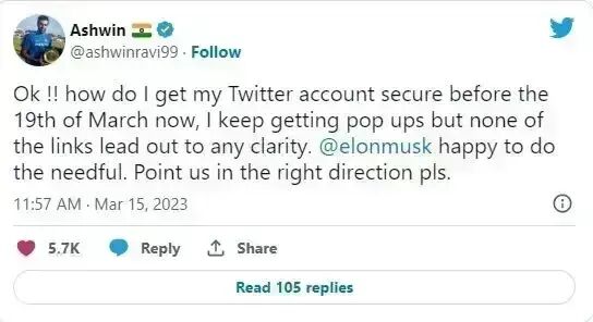 ऑफ स्पिनर ने ट्वीट किया, "ठीक है !! मैं अब 19 मार्च से पहले अपने ट्विटर अकाउंट को कैसे सुरक्षित कर सकता हूँ, मुझे पॉप-अप मिलते रहते हैं लेकिन कोई भी लिंक किसी स्पष्टता की ओर नहीं ले जाता है। एलन मस्क जरूरतमंदों की सहायता करने पर खुश होते हैं। कृपया हमें सही दिशा में इंगित करें। प्लीज"
