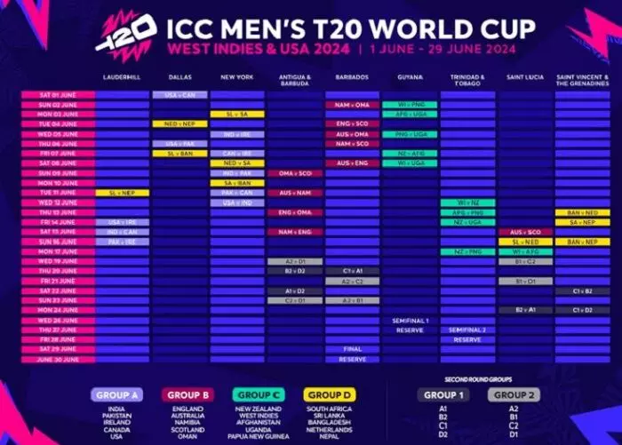 नई दिल्ली । अंतरराष्ट्रीय क्रिकेट परिषद (आईसीसी) ने शुक्रवार रात पुरुष टी20 विश्व कप के नौवें संस्करण के कार्यक्रम की घोषणा कर की है। टी-20 विश्व कप का आयोजन 1 से 29 जून तक वेस्टइंडीज और संयुक्त राज्य अमेरिका के सह-मेजबानी में किया जाएगा। आईसीसी पुरुष टी20 इवेंट में रिकॉर्ड 20 टीमों को चार समूहों में विभाजित किया जाएगा, जिनके बीच 55 मैच खेले जाएंगे। टूर्नामेंट में सह-मेजबान वेस्टइंडीज और संयुक्त राज्य अमेरिका के साथ-साथ अफगानिस्तान, ऑस्ट्रेलिया, बांग्लादेश, कनाडा, इंग्लैंड, भारत, आयरलैंड, नामीबिया, नेपाल, नीदरलैंड, न्यूजीलैंड, ओमान, पाकिस्तान, पापुआ न्यू गिनी (पीएनजी), स्कॉटलैंड, दक्षिण अफ्रीका, श्रीलंका और युगांडा की टीमें हिस्सा लेंगी।
