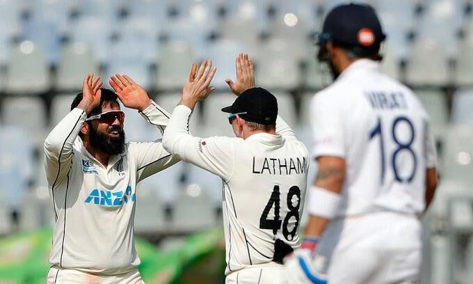 भारत की ओर से ओपनिंग जोड़ी मयंक अग्रवाल और शुभमन गिल ने टीम को अच्छी शुरुआत दी। दोनों खिलाड़ियों ने पहले विकेट के लिए 80 रनों की साझेदारी की। न्यूजीलैंड के स्पिनर एजाज पटेल ने इस जोड़ी को तोड़ दिया। एजाज ने गिल को 44 रन के स्कोर पर पवेलियन भेज दिया। इसके इसी ओवर की अगली गेंदों पर विराट कोहली और चेतेश्वर पुजारा को शून्य के स्कोर पर आउट किया। मयंक अग्रवाल ने 119 गेंदों में 6 चौके और 2 छक्कों की मदद से अपना पांचवां शतक पूरा किया। श्रेयस अय्यर एजाज पटेल की गेंद पर 18 रन बनाकर कैच आउट हुए और उन्होंने 41 गेंदों का सामना किया। इसके बाद साहा और मयंक ने कोई और नुकसान नहीं होने दिया। न्यूजीलैंड की तरफ से चारों विकेट एजाज पटेल ने लिए