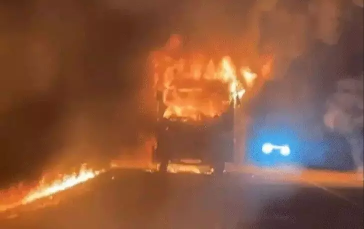 जानकारी के अनुसार, बस का एक टायर फट गया और उसमें आग लग गई। आग मिनटों में फैलती गई और डीजल सड़क पर गिरने के कारण आसपास भी आग फैलने लगी। यात्रियों में अफरा-तफरी मच गई। कई यात्री बस से बाहर कूदकर अपनी जान बचाने लगे।
