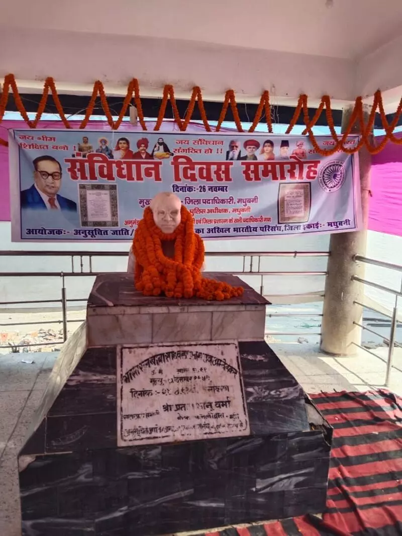 मधुबनी । जिला मुख्यालय सहित सुदूर ग्रामीण परिवेश में संविधान दिवस पर रविवार को कार्यक्रम आयोजित हुई। मुख्यालय स्थित समाहरणालय द्वार के समक्ष स्थापित बाबा साहब भीमराव अंबेडकर के प्रतिमा पर माल्यार्पण व पुष्पांजलि अर्पित किया गया। अवसर पर पुलिस अधीक्षक सुशील कुमार, एडीएम नरेश झा, सदर एसडीओ अश्वनी कुमार सहित प्रशासनिक अधिकारी उपस्थित रहे।अवसर पर पदाधिकारियों ने भारत के संविधान की अक्षुण्णता व वैधता कानूनन व्यवस्थित धाराओं के तदनुरूप निर्देश में कार्य निर्वहन की शपथ दोहराया। अवसर पर एसपी सुशील कुमार ने कहा कि भारतीय संविधान की अक्षुण्णता की रक्षा सभी आमजनों का पुनीत कर्त्तव्य है।