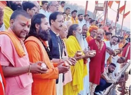 संघ की प्रेरणा से जबलपुर के ग्वारीघाट पर वर्ष प्रतिपदा के आयोजन में वेदप्रकाश शर्मा व अन्य।
