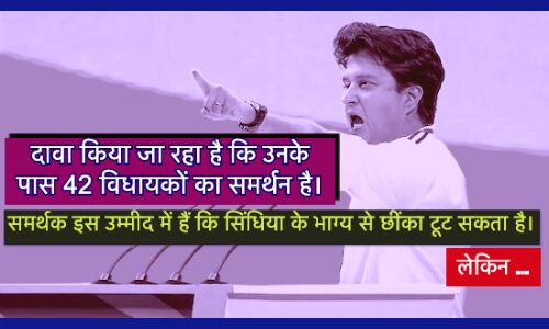 सीबीआई या ईडी में अब तक मध्य प्रदेश के मुख्यमंत्री कमलनाथ को लेकर इस तरह की कोई कयासबाजी नहीं है। और न ही सिंधिया के भाग्य से कोई छींका टूट रहा है। चिदंबरम और कर्नाटक के कांग्रेस नेता डी के शिवकुमार से हठकर कमलनाथ का मामला कुछ अलग है। गांधी परिवार से नजदीकियां होने के साथ-साथ उनके कार्पाेरेट घरानों से व्यक्तिगत तौर पर अच्छे संबंध हैं। कुछ देर के लिए मान भी लें कि सिंधिया खेमे में 42 विधायक हैं तब क्या यह संख्या दिग्विजय सिंह या कमलनाथ खेमे से पार जाती नजर आ रही है? अगर नहीं तो सिंधिया के भाग्य से छींका टूटने का ख्याल किस आधार पर किया जा रहा है? उनसे ज्यादा विधायकों की संख्या तो दिग्विजय और कमलनाथ के पास है। तो वे क्यों भला सिंधिया का मुख्यमंत्री बनने देंगे? वैसे तो कमलनाथ फिलहाल अभी किसी तरह के कानूनी पेंच में फंसते नजर नहीं आ रहे हैं, अगर किसी कारण ऐसी स्थिति आती भी है तो भी सिंधिया मुख्यमंत्री बनने से रहे। उनके बारे में पखवाड़ा भर से चल रही चर्चाओं और समर्थकों द्वारा बयानबाजी से जो नुकसान सिंधिया का हुआ है वह शायद सोच नहीं पा रहे। गांधी परिवार में भी उनका सद्भाव कम हुआ है।
