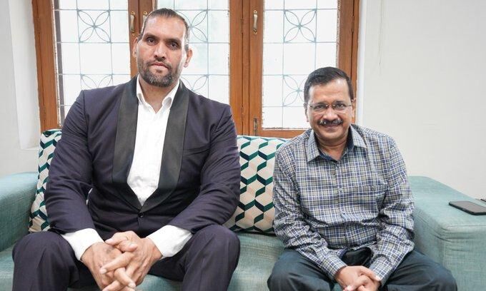 अरविन्द केजरीवाल की खली से मुलाकात, पहलवान राजनीति के अखाड़े में लगा सकते है दांव