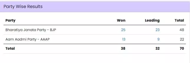 चुनाव आयोग के आंकड़ों के अनुसार, दिल्ली विधानसभा चुनाव की 70 सीटों में से 38 सीट पर नतीजे साफ़ हो गए हैं। इनमें से 25 बीजेपी के खाते में और 13 सीट आम आदमी पार्टी के खाते में गई हैं।