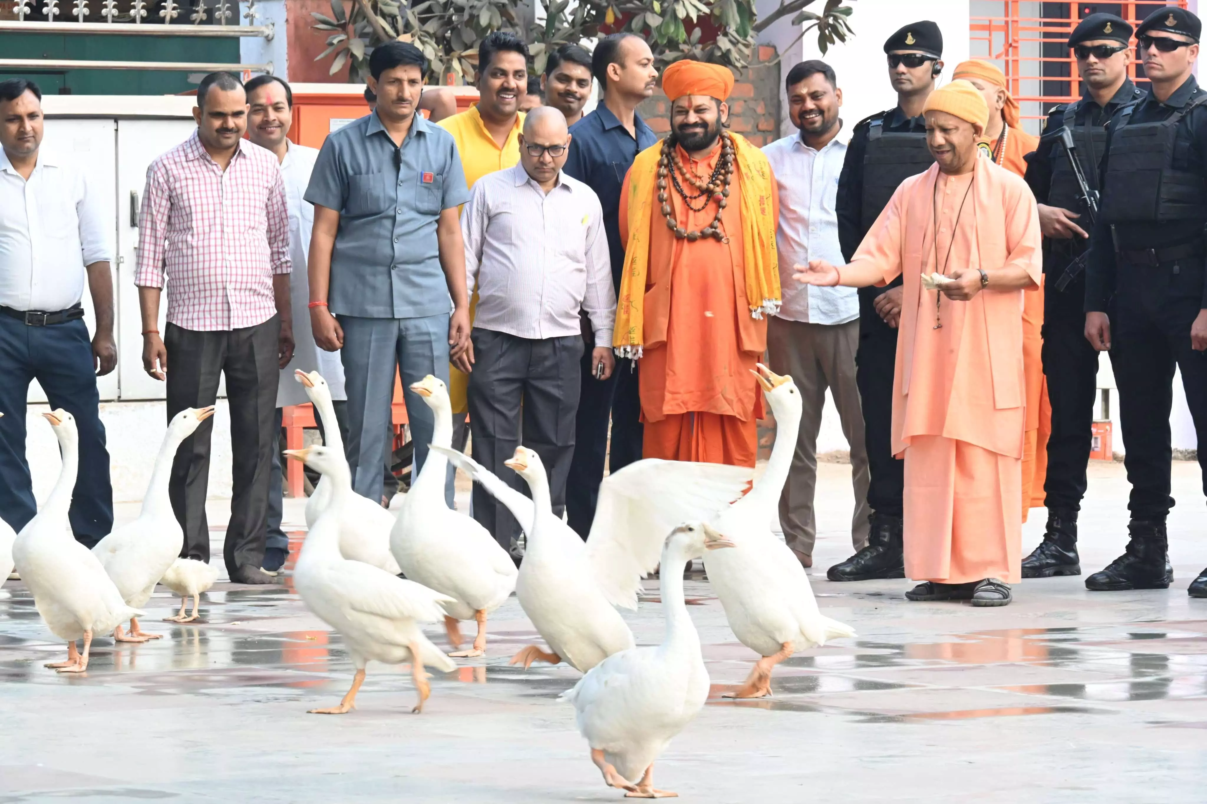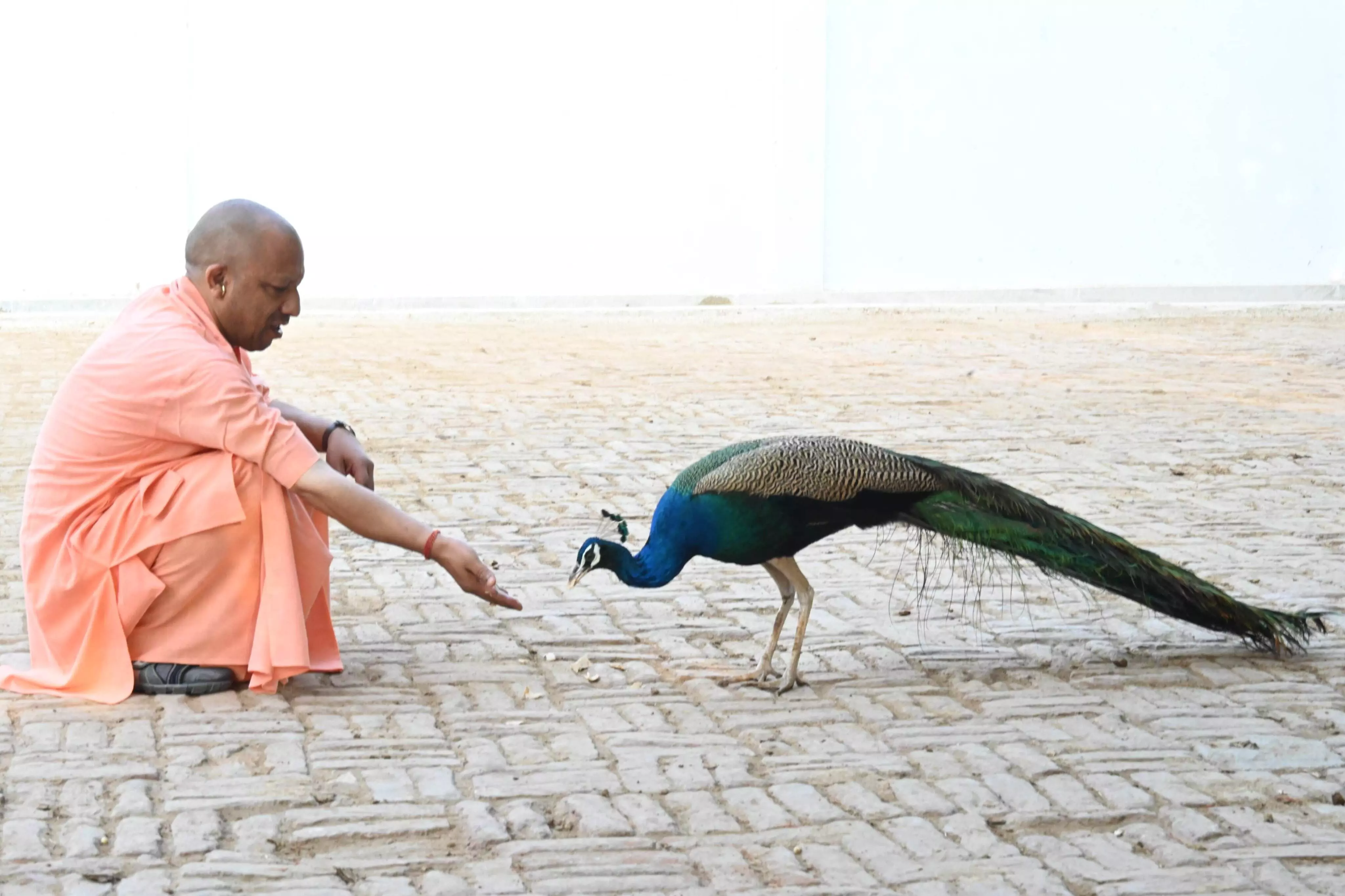 गोरखपुर, उत्तर प्रदेश: होली के अवसर पर मुख्यमंत्री योगी आदित्यनाथ ने गौ माता को गुलाल का तिलक लगाया और पक्षियों को खाना खिलाया।