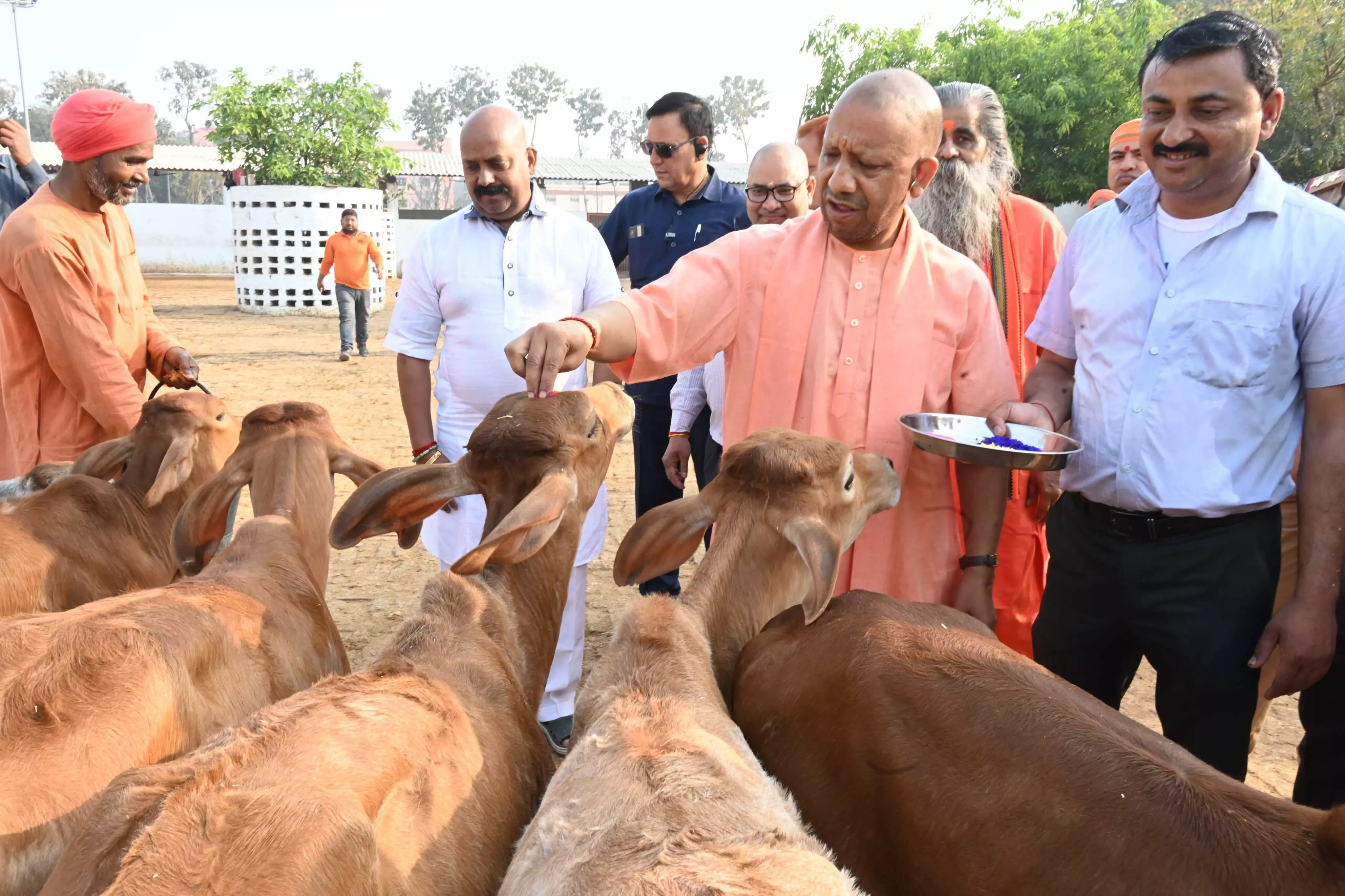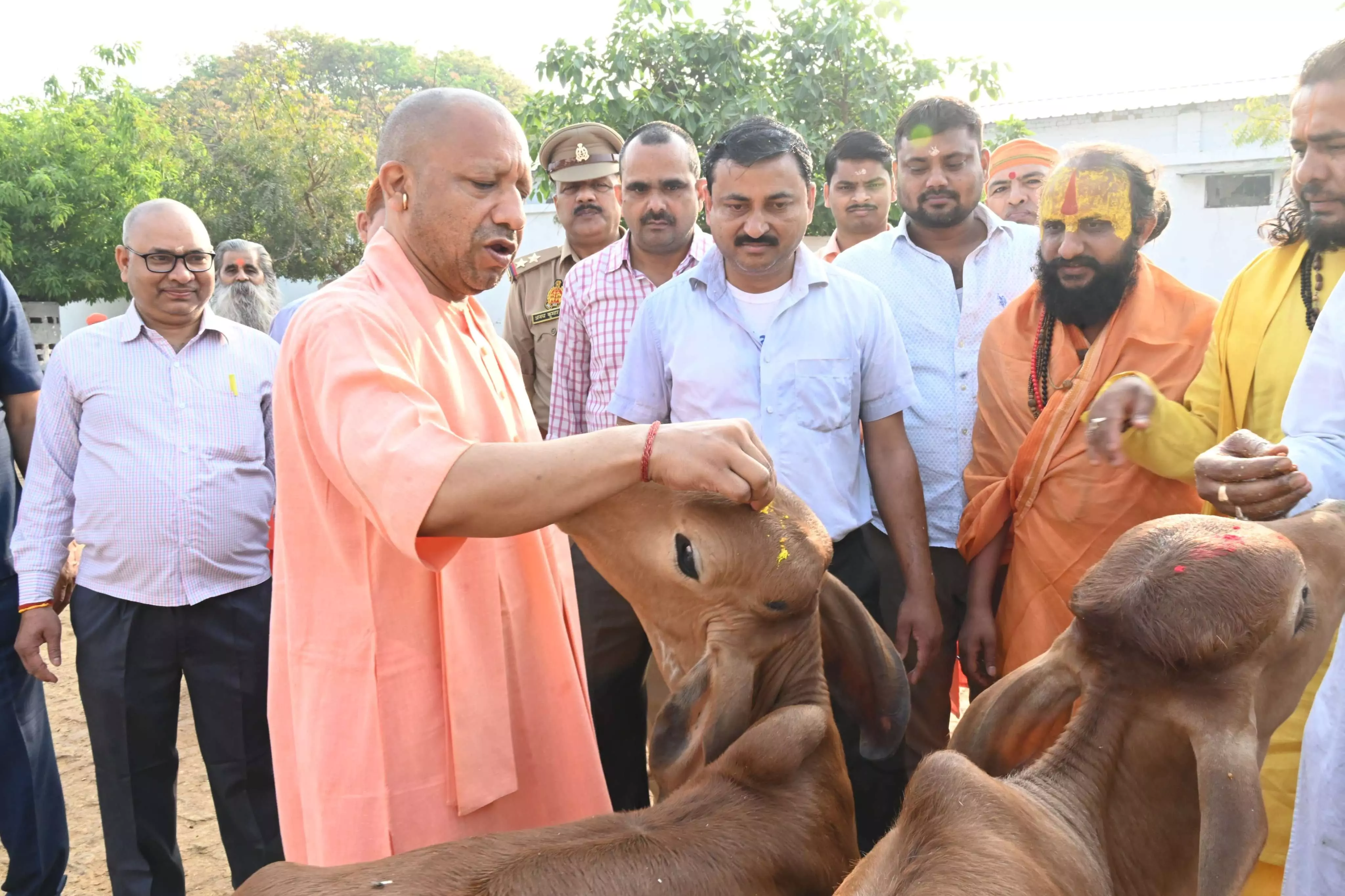 मुख्यमंत्री योगी आदित्यनाथ ने गौ माता को लगाया गुलाल