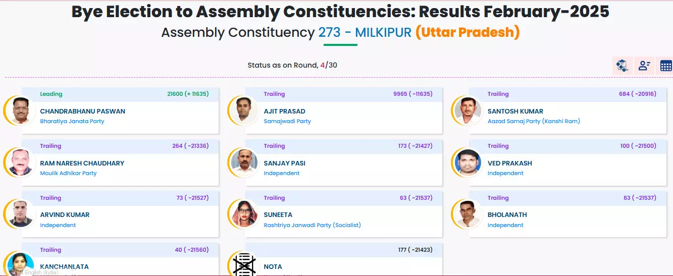 मिल्कीपुर उपचुनाव EVM के पहले राउंड की गिनती में 3995 वोट से भाजपा के प्रत्याशी चंद्रभानु पासवान आगे।