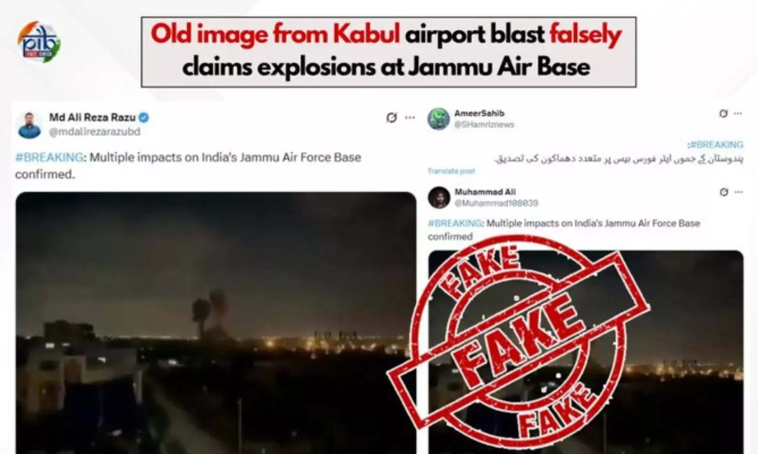 सोशल मीडिया पर कुछ तस्वीरों के साथ दावा किया गया कि जम्मू में स्थित भारतीय वायुसेना के बेस पर कई विस्फोट हुए हैं। लोगों में दहशत फैलाने का यह प्रयास विफल रहा क्योंकि पीआईबी फैक्ट चेक की टीम ने तुरंत बताया कि वायरल की जा रही तस्वीर असल में अगस्त 2021 में काबुल एयरपोर्ट पर हुए विस्फोट की है। इस प्रकार एक अंतरराष्ट्रीय त्रासदी को भारतीय संदर्भ में जोड़ने का यह ओछा प्रयास मात्र एक भ्रम फैलाने की साजिश थी।