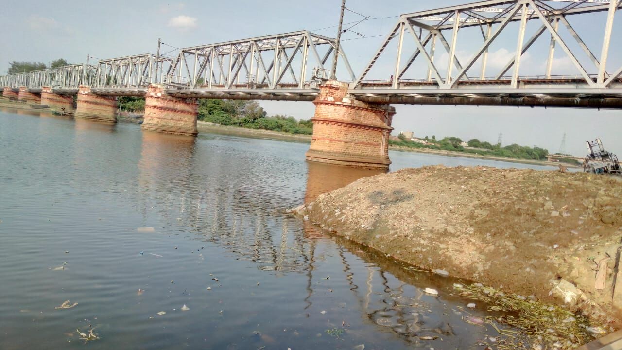 रेलवे पुल के नीचे यमुना के बीचों बीच लगा सिल्ट का ढेर, बरसात का जलस्तर बढ़ते ही ये सारी गंदगी यमुना में समा जाएगी