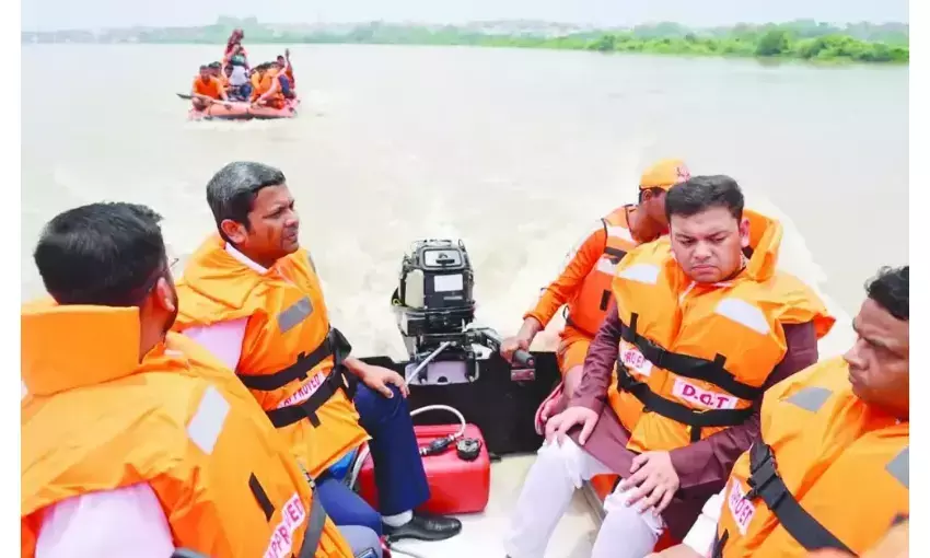 मथुरा। राज्यमंत्री स्वतंत्र प्रभारी बेसिक शिक्षा विभाग प्रभारी मंत्री संदीप सिंह ने यमुना जल स्तर बढ़ने के दृष्टिगत जिलाधिकारी पुलकित खरे, अपर जिलाधिकारी वित्त एवं राजस्व योगानन्द पाण्डेय, उप जिलाधिकारी सदर अजय जैन सहित अन्य अधिकारियों के साथ बाढ़ प्रभावित क्षेत्र जयसिंहपुरा का जायजा लिया। स्टीमर के माध्यम से यमुना जी का भ्रमण कर रिहायशी इलाकों को देखा।