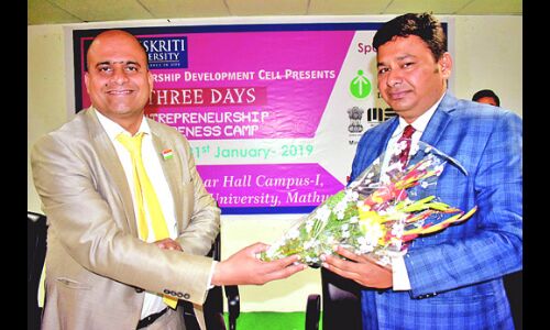 मथुरा। उद्यमिता एक चुनौती है लेकिन जिन लोगों में उद्योग की जानकारी, खुद पर विश्वास और खतरा उठाने की क्षमता होती है, उन्हें सफलता से नहीं रोका जा सकता। भारत युवाओं का देश है। हर युवा को रोजगार प्रदान करना किसी के लिए भी आसान बात नहीं है। ऐसे में युवा पीढ़ी को उद्यमिता के क्षेत्र में प्रेरित किया जाना जरूरी है। उक्त उद्गार गुरुवार को तीन दिवसीय एंटरप्रेन्योरशिप अवेयरनेस कैम्प के समापन अवसर पर डिप्टी डायरेक्टर एमएसएमई इंद्रजीत सिंह यादव ने संस्कृति यूनिवर्सिटी के छात्र-छात्राओं को सम्बोधित करते हुए व्यक्त किए।