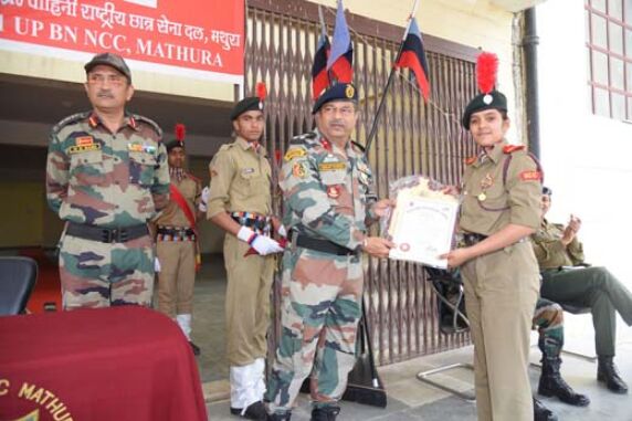 मथुरा। वेटेरिनरी विश्वविद्यालय में 11 यूपी बटालियन एनसीसी के तत्वावधान में कैंप कमाडेंट कर्नल हरी कृष्ण राना के नेतृत्व में संचालित संयुक्त वार्षिक प्रशिक्षण शिविर में अलीगढ़ ग्रुप के ग्रुप कमाण्डर ब्रिगेडियर संजय खन्ना ने एनसीसी कैंप के सम्पर्ण कैडिट्स को सम्बोधित किया। अपने सम्बोधन में सशस्त्र सेना, देशभक्ति, धर्मनिर्पेक्षता, प्रेम, भाईचारा तथा समाज सेवा के लिए प्रोत्साहित किया। उनके द्वारा गणतंत्र दिवस परेड 2019 में चयनित कैडिट्स को स्मृति चिन्ह तथा प्रशस्ति पत्र प्रदान कर सम्मानित किया गया। ग्रुप कमाण्डर द्वारा कैंप का सम्पूर्ण निरीक्षण भी किया गया।