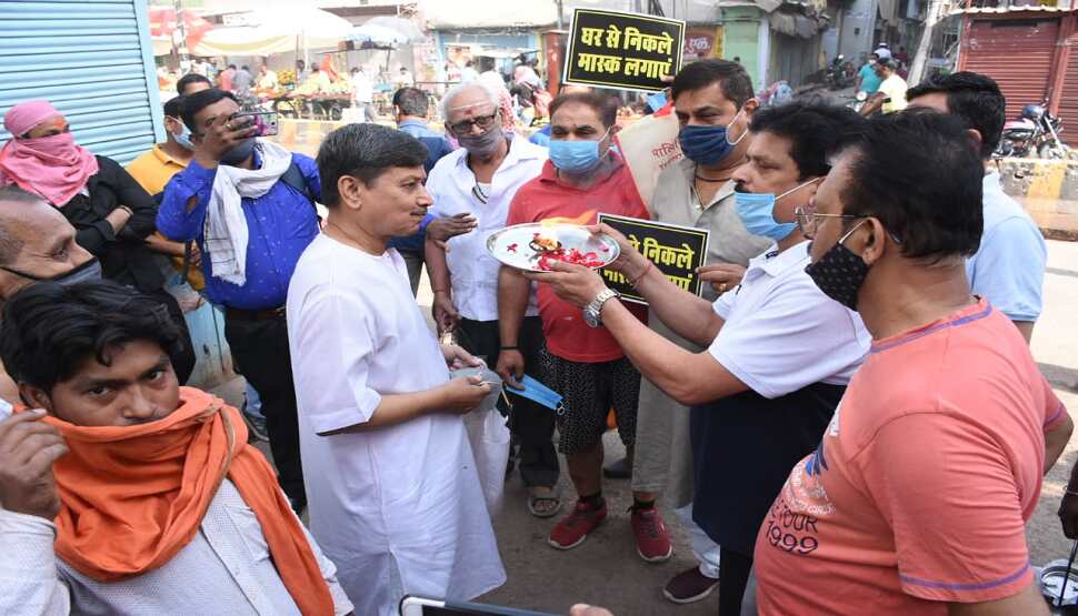 वाराणसी: व्यापारियों का गजब अभियान, मास्क न पहनने वालों की उतारी आरती